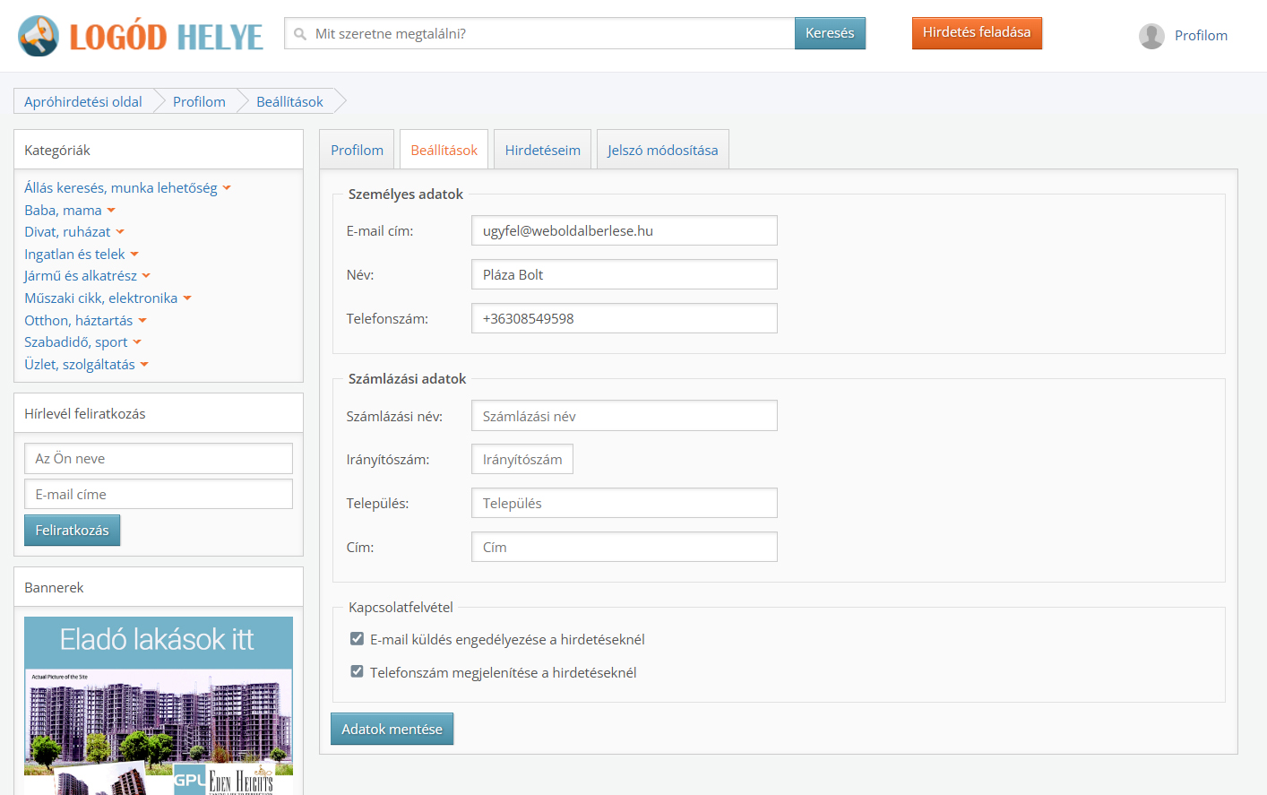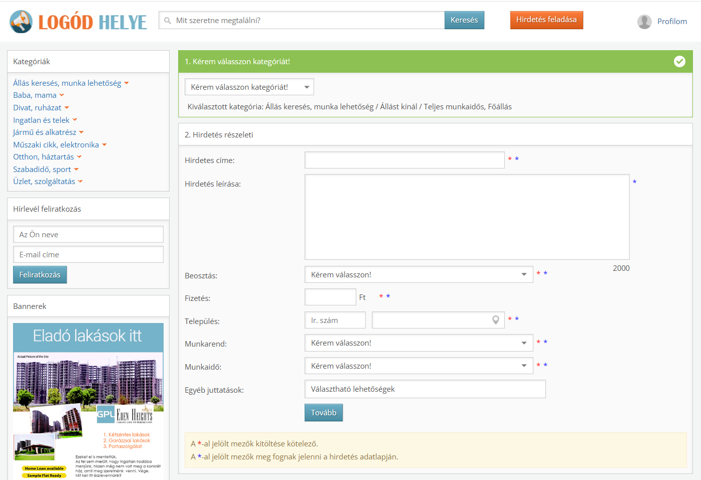 • Hirdetésfeladás