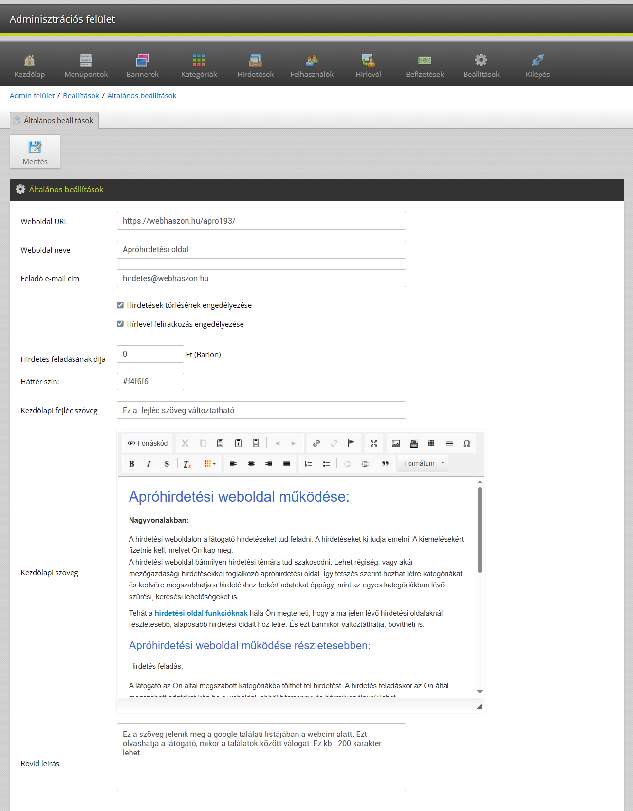 Hirdetési weboldal adminisztrációs felületén elérhető funkciók